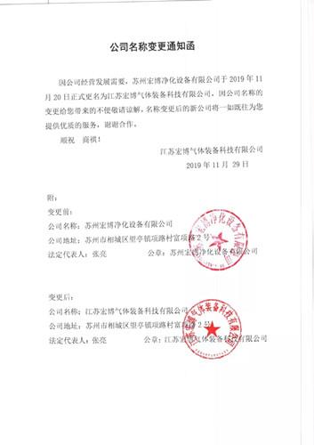 為適應(yīng)市場經(jīng)營和公司發(fā)展需要,2019年11月20日,經(jīng)蘇州市相城區(qū)行政審批局核準(zhǔn),原“蘇州宏博凈化設(shè)備有限公司”正式變更登記為“江蘇宏博氣體裝備科技有限公司”。