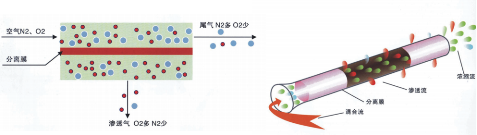 膜分離制氮機技術是根據(jù)空氣中的氮氣和氧氣在膜兩側壓差作用下,在膜中的溶解度和擴散系數(shù)不同而實現(xiàn)分離的,滲透率快的水蒸汽、氧氣等一些氣體先透過膜,成為富氧氣體,而滲透率較慢的氮氣則滯留富集,成為干燥的富氮氣體,達到氧氮分離的目的。